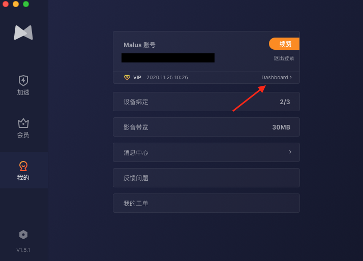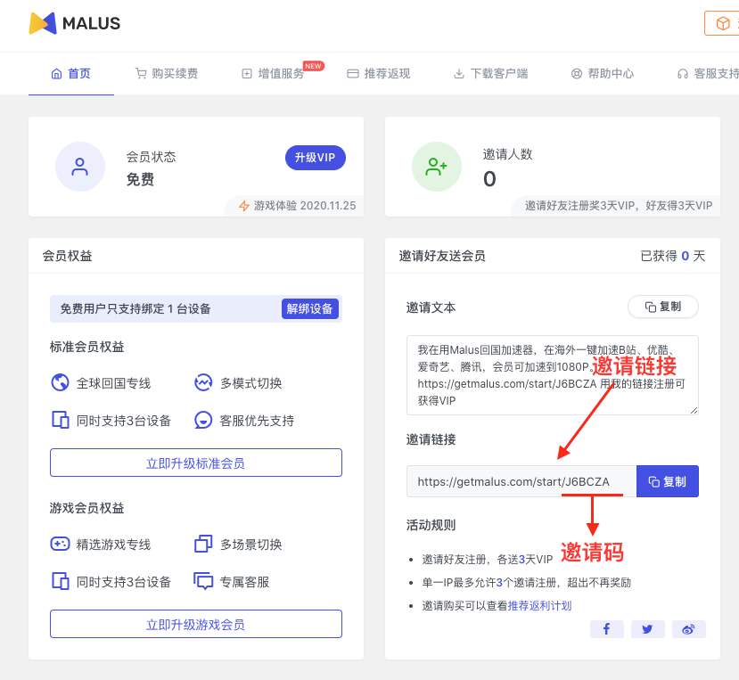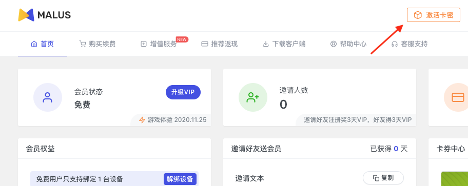 买Malus VIP,会得到1张体验卡,你可以送给朋友,送多少返多少;或者你从别人那里得到一张体验卡。登录官网,在「用户中心」内,可以查看你的体验卡。