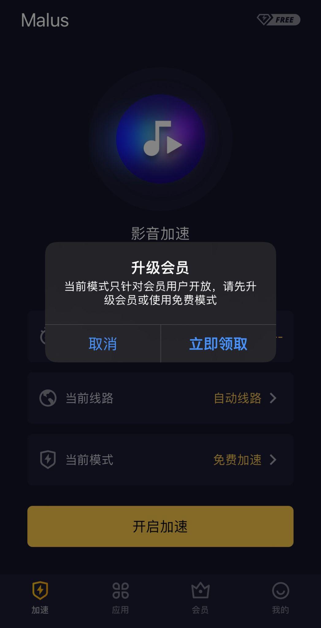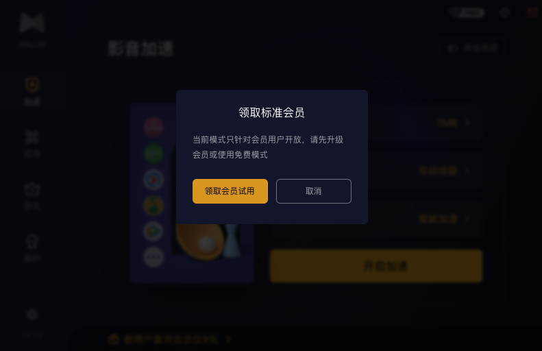 新用户首次点击开启影音加速,会弹出弹窗提示领取会员试用。