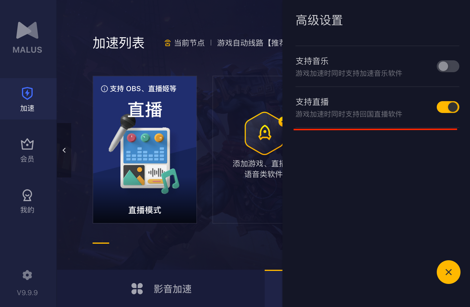 Malus 推荐用户购买游戏会员并使用直播加速场景,由于直播线路经过单独优化,延迟低,适合直播及语音类软件加速。而影音加速线路仅对音乐视频软件优化,我们无法保证直播效果。