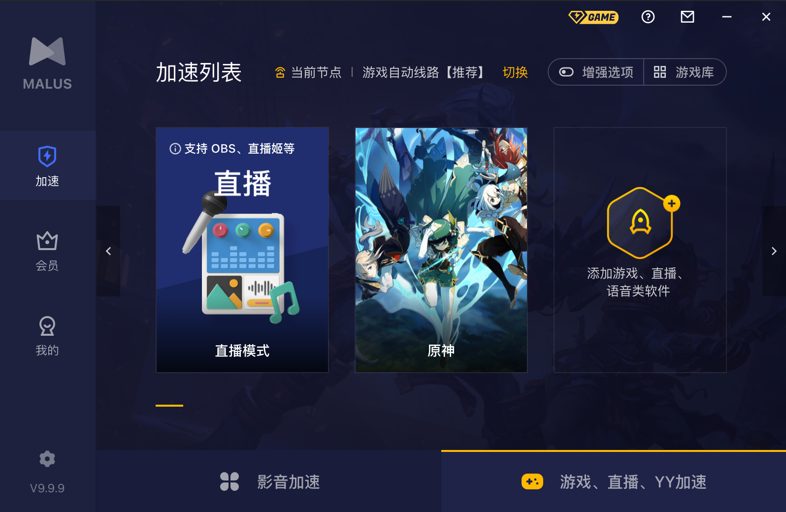 打开 Malus 加速器,切换到游戏 TAB,在游戏库单独添加直播模式,开启加速并重启直播软件。