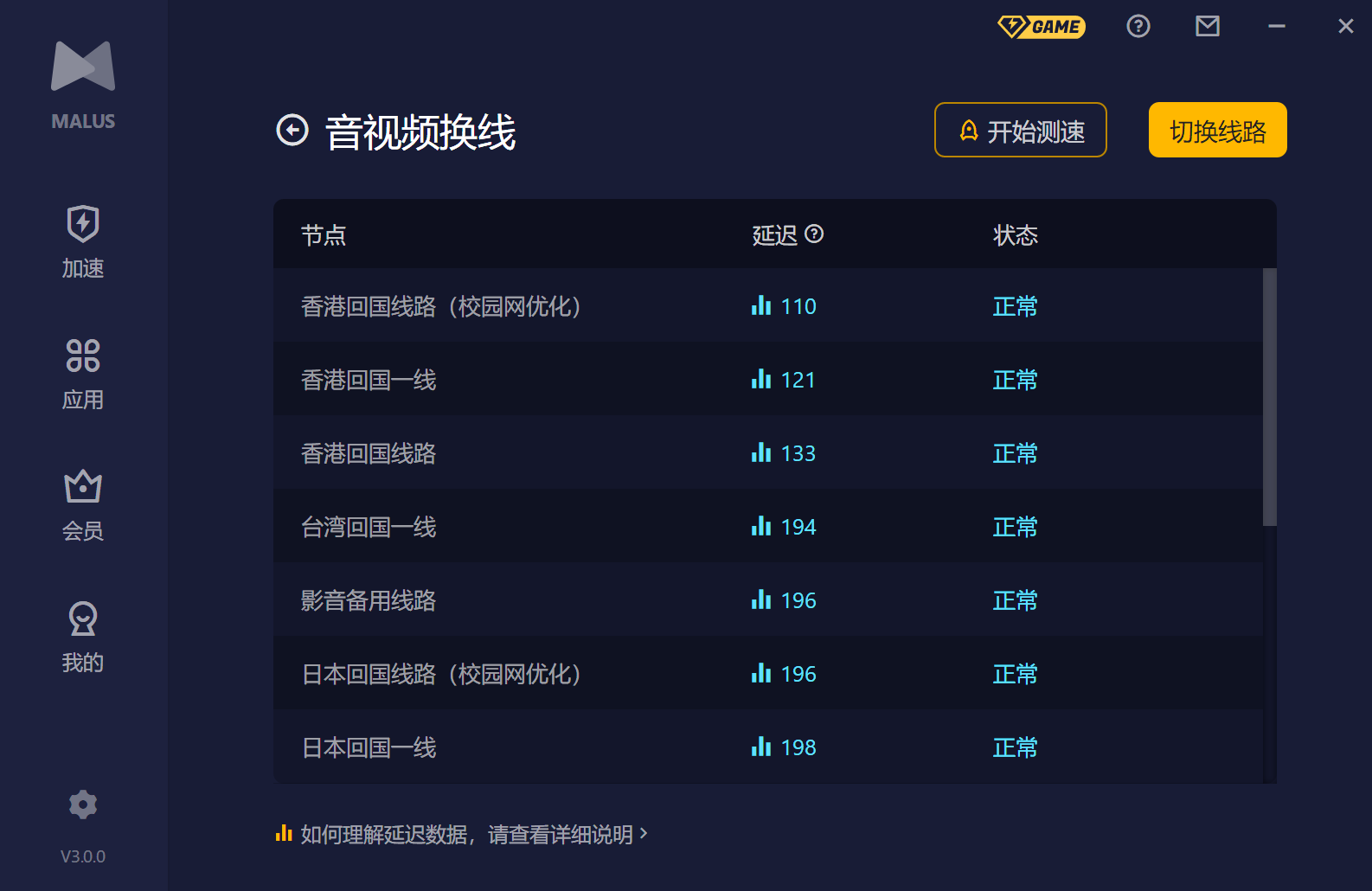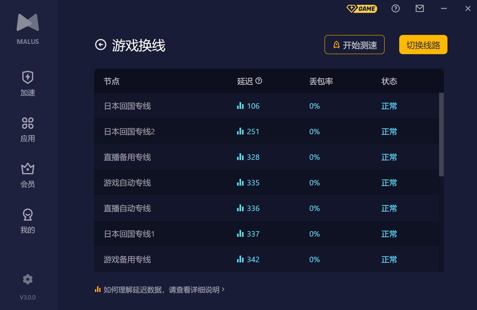 在最新版本的 Malus 客户端软件中,我们对游戏模式的线路延迟测试方式进行了调整。现在展示的游戏线路延迟,是计算从用户电脑到 Malus 在各地区的边缘加速网络再通过专线加速回到 Malus 国内加速服务器后再返回用户电脑的 RTT 时间。这种计算方式可以相对较好地反应出用户使用 Malus 游戏加速后可以获得的延迟。*实际游戏内的延迟数据由于游戏服务器的具体位置会有一些出入,不过上下范围不会很大。